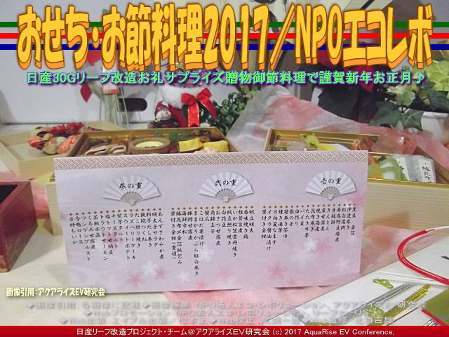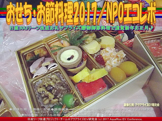 以上、おせち料理2017丁酉/NPOエコレボの各画像はクリックで全て640x480pxlsに拡大します。 ※本ブログページのすべての画像3枚をスライドショー480x360pxlsで見られます。 |