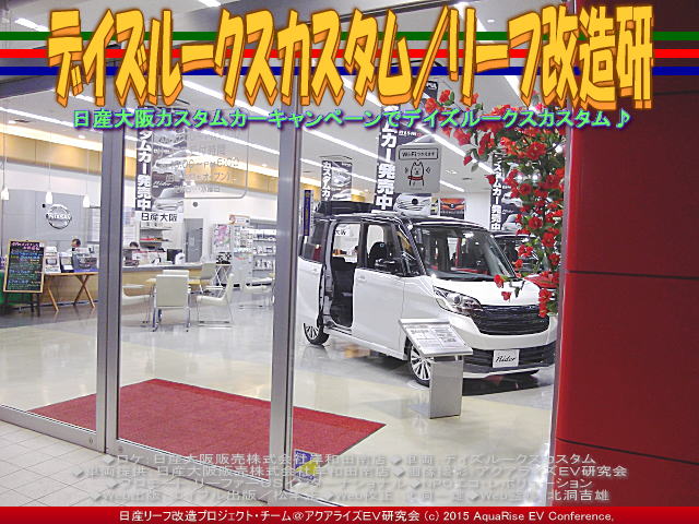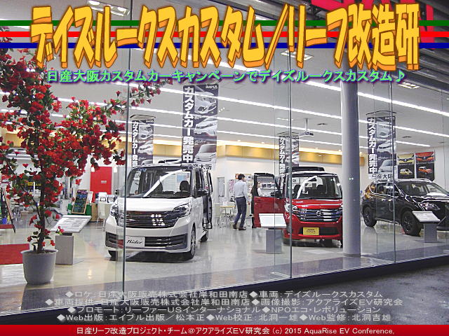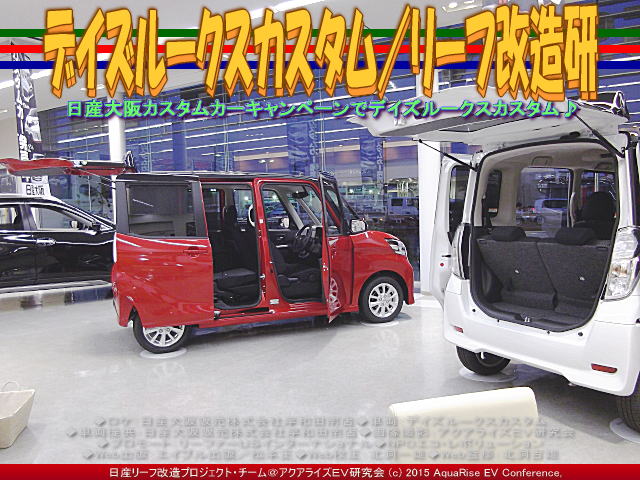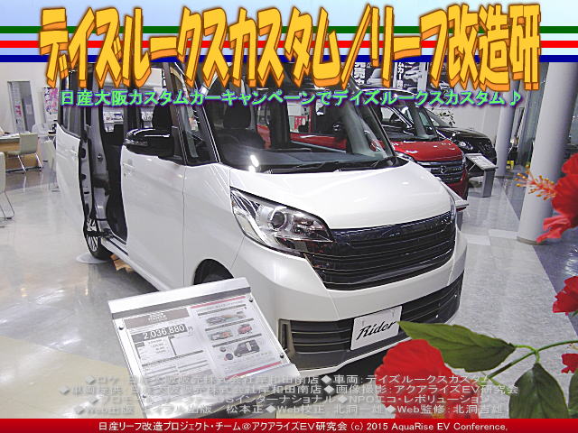 ◆ロケ:日産大阪販売株式会社岸和田南店 ◆車両:デイズルークスカスタム ◆車両提供:日産大阪販売株式会社岸和田南店 ◆画像撮影:アクアライズEV研究会 ◆プロモート:リーファーUSインターナショナル、NPOエコ・レボリューション ◆Web出版:エイブル出版/松本正 ◆Web校正:北洞一雄 ◆Web監修:北洞吉雄 | ||||