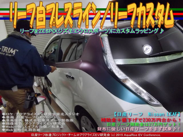 今日の紹介は、『リーフ白プレスライン(2)/リーフカスタム』です。 昨日の『リーフ白プレスライン/リーフカスタム』の続きです。紹介する画像のタイトルは統一して<リーフ白プレスライン/リーフカスタム>としています。 <日産リーフ白X>が<ZESPO ジズモエウロ・スポーツ(バーチャル画像)>にドレスアップされていく過程を、今回はカーラッピング作業・とりわけナイフレステープを使ったプレスラインの形取りパート2の紹介です。 | ||||