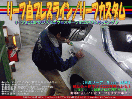 本日の紹介は、『リーフ白プレスライン/リーフカスタム』です。 <日産リーフ白X>が<ZESPO ジズモエウロ・スポーツ(バーチャル画像)>にドレスアップされていく過程の関連ファイルとして、今回はカーラッピング作業・とりわけナイフレステープを使ったプレスラインの形取りの紹介です。 | ||||