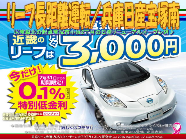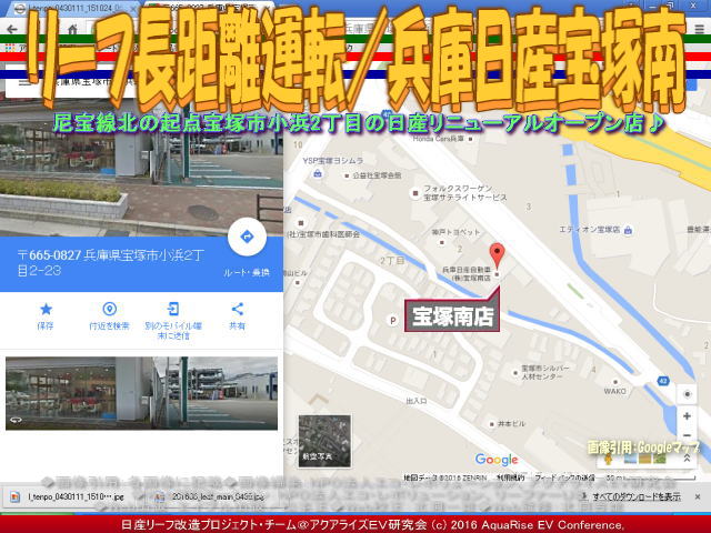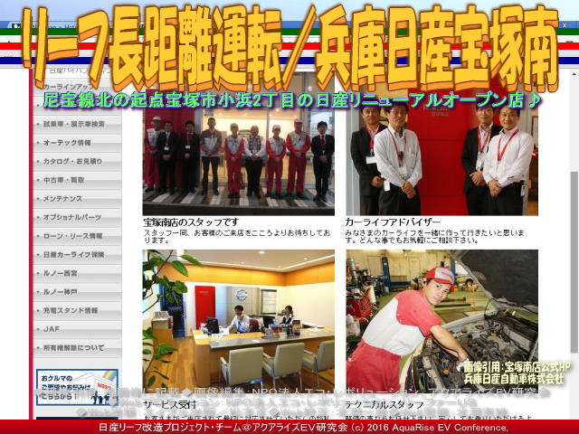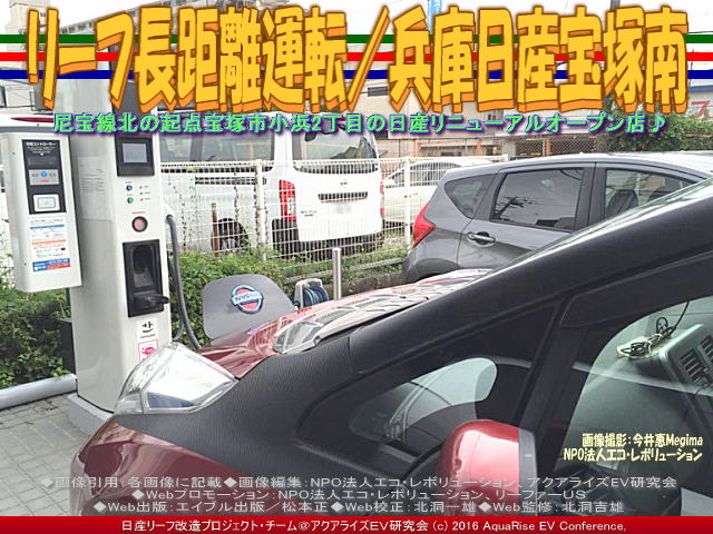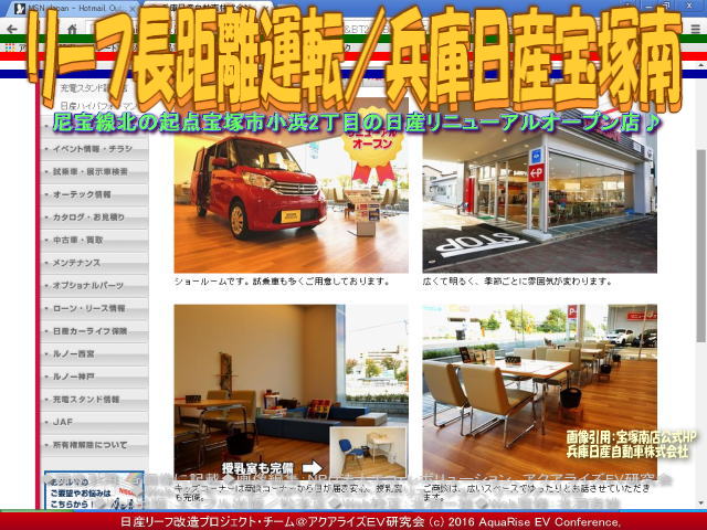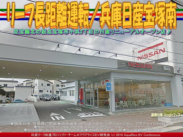 先日、兵庫日産宝塚南店に友人と一緒に立ち寄りました。私の愛車ドレスアップ日産リーフ改造カスタムカー「ラプソディア号」に乗ってです。 この時の記事は、私のfacebookや別のブログでは、2016年6月27日にタイトル「兵庫日産宝塚南店」で以下のようにアップしています。<兵庫日産宝塚南店で急速充電。兵庫県宝塚市小浜2丁目2-23、通称尼宝線の北の起点にあります。この尼宝線をそのまま北に走れば、すぐに国道176号線に合流します。前に訪れたときには、お店のリニューアル工事中でしたが、この日はもうできていて、きれいなお店になっていました。店内には、新しいリーフが展示されていました。>と書きました。※ここでいう尼宝線とは、「あまほうせん」、「にほうせん」と読んで「兵庫県道42号尼崎宝塚線」のことです。尼崎市から宝塚市を結ぶ主要地方道で、南側に接続する兵庫県道192号尼崎港崇徳院線とともに尼宝線(あまほうせん、にほうせん)と呼称されています。 【リーフ長距離運転/兵庫日産宝塚南 01】 さらに続けると、<友人と一緒に行きました。そこに着くまでは、電気自動車に対し、否定的なことばかり言っていましたが、お店でコーヒーをいれていただき、クッキーやあめだまを食べていると、彼もいつのまにか、リーフのファンになったようでした。お店の方も、さりげなく後押ししてくれました。>と書きました。この兵庫日産宝塚南店界隈は、各社の自動車ディーラーが並んでいます。日産ディーラーは三店舗があります。東から、まず兵庫日産宝塚南店、兵庫日産宝塚北店、そして日産大阪宝塚店です。各店舗には急速充電器が設置されていて、24時間稼働でとても重宝しています。 【リーフ長距離運転/兵庫日産宝塚南 02】 以下に兵庫日産宝塚南店のお店の情報を以下に紹介します。兵庫日産宝塚南店の正式名称は兵庫日産自動車株式会社宝塚南店です。 【兵庫日産宝塚南店】 □お店の名前: 兵庫日産宝塚南店 □よみ: ひょうごにっさんたからづかみなみてん □住所: 〒665-0827 兵庫県宝塚市小浜2丁目2-23 □電話: Tel.0797-86-8623 Fax.0797-86-8629 □営業時間: 10:00~19:00 □サービス受付: 10:00~18:00 □200V普通充電器: 設置有り(お店の営業時間に準じる) □急速充電器: 設置有り(24時間稼働) □公式ページ: 兵庫日産宝塚南店 □アクセス: マップはこちらから。 ※以上、兵庫日産宝塚南店の公式ページを参照、一部レイアウト編集。データは2016年7月時点のものです。時間の経過により正確でなくなる場合がありますので、ご了承ください。 【リーフ長距離運転/兵庫日産宝塚南 03】 なにも私は日産リーフの営業マンではないですが、友人にはこれだけは言っておきたいです。日産リーフはスポーツカー並みに鋭い出足、静かな走りからは想像できない凄い加速、ガソリン車では信じられない燃費(EV電気自動車では電費という)、そして地球にやさしいCO2排出ガス削減の使命「ゼロエミッション」への貢献。乗り換えるなら、地球温暖化対策にひと肌脱いで、一歩踏み出してEV電気自動車に乗換えようよ!と。 【リーフ長距離運転/兵庫日産宝塚南 04】 ちなみに、本アクアライズEV研究会で作成してあるCHAdeMO方式の急速充電スポットや200V普通充電スタンド関連のブログは以下のファイルに、五十音別順にまとめています。 『急速充電スポット160601/リーフ改造』 参考までにご覧いただければ幸いです。また、お仕事や余暇でEV電気自動車に乗って出かけた長距離運転・長距離ドライブや出先の急速充電スポットで取材できた事柄をブログに取り上げています。いつの間にか膨大なページ数に及んでいますので、このブログページを含んで、以下にリストします。 『リーフ急速充電/兵庫日産宝塚南店』 『リーフ急速充電/兵庫日産玉津店』 『兵庫日産玉津店急速充電/リーフ改造』 『リーフ長距離運転/兵庫日産玉津店』 『リーフ急速充電/兵庫日産東灘店』 『兵庫日産玉津店急速充電/兵庫日産東灘』 『兵庫日産玉津店急速充電/滝野温泉ぽかぽ』 『兵庫日産玉津店急速充電/段が峰千町峠』 『兵庫日産玉津店急速充電/雲の上の音楽会』 『雲の上の音楽会(2)/日産リーフ旅』 『雲の上の音楽会/日産リーフ旅』 『神河こっとん亭(2)/兵庫日産玉津店急速充電』 『兵庫日産玉津店急速充電/神河こっとん亭』 『急速充電/ローソン神崎南インター店』 『長距離運転/ローソン神崎南インター』 『兵庫日産玉津店急速充電/神河町砥峰高原』 『長距離運転砥峰高原/リーフ改造』 『急速充電山陽道淡河PA上り/リーフ改造』 『長距離運転淡河PA上り/リーフ改造』 『淡河PAシャワーステーション/リーフ改造』 『長距離運転処女塚古墳/リーフ改造』 『長距離運転神戸処女塚/リーフ改造』 『急速充電兵庫日産灘店/リーフ改造』 『長距離運転兵庫日産灘/リーフ改造』 『急速充電兵庫日産御影店/リーフ改造』 『長距離運転兵庫日産御影/リーフ改造』 『兵庫日産玉津店急速充電/兵庫日産姫路東』 『リーフ急速充電/兵庫日産姫路東店』 『リ