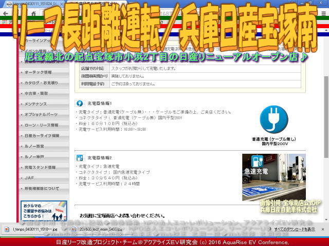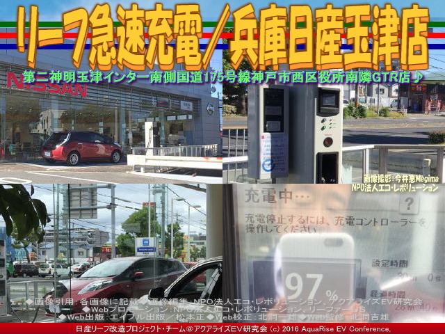 先日と言っても、2016年先月6月のことですが、兵庫日産玉津店で、私の愛車ドレスアップ日産リーフ改造カスタムカー「ラプソディア号」の急速充電をしました。兵庫日産玉津店は久しぶりです。兵庫日産玉津店は明石のすぐ北ですが、神戸市西区になります。過去兵庫日産玉津店は年に数回、2014年の秋に初めて立ち寄らせていただいてからたまに急速充電に訪れます。 【リーフ急速充電/兵庫日産玉津店 01】 兵庫日産玉津店の公式HP(ホームページ)を閲覧すると、<お客様に気軽に足を運んで頂けるお店づくりを心掛けています。第二神明玉津インター南側、国道175号線沿いにあります玉津店です。場所は神戸市西区役所南隣です。当店は当社で唯一のGTR取扱認定店舗となっており現車もご覧頂けます。また「女性とお子様に優しいお店」を合言葉にキッズコーナーや毎週火曜日のレディ-スデー等、ワクワク・ドキドキをご用意してスタッフ一同お待ちしております。>と書かれています。 【リーフ急速充電/兵庫日産玉津店 02】 そして兵庫日産玉津店のスタッフの方々のお写真も掲載されています。折角このブログで、私の愛車ドレスアップ日産リーフ改造カスタムカー「ラプソディア号」の急速充電でお世話になっている兵庫日産玉津店を紹介させていただくのですから、PCモニターで表示された画像をスクリーンショットして利用させていただきます。また、別の機会に改めて掲載させていただきます。その時は、どうかよろしくお願いたします。 【リーフ急速充電/兵庫日産玉津店 03】 さて、以下に兵庫日産玉津店の急速充電情報を紹介します。 【兵庫日産玉津店の充電器情報】 □正式名称: 兵庫日産玉津店 □よみ: ひょうごにっさんたまつてん □所在地: 〒651-2144 兵庫県神戸市西区玉津町小山180-1 □電話番号: 078-928-9823 □FAX番号: 078-928-9822 □営業時間: 10:00~19:00 □サービス受付: 10:00~18:00 □普通充電と急速充電情報: 普通充電は日産車のみ充電可。急速充電はCHAdeMO急速充電器プロトコルに対応したEVのみ充電可。(法人のお客さまも利用可)、日産ゼロ・エミッションサポートプログラム会員は、無料。店舗での対応は「スタッフがお預かりして充電いたします。夜間車両預かりは実施しておりません。利用電話予約は承っておりません。」 ★普通充電器情報: ・充電タイプ=普通充電(ケーブル無)・・・ケーブルをご準備の上、ご来店ください。 ・コネクタタイプ=普通充電(ケーブル無)国内平型200V ・料金=60分108円(税込み) ・充電サービス利用時間:10:00~19:00 ★急速充電情報: ・充電タイプ=急速充電 ・コネクタタイプ= 国内急速充電CHAdeMOタイプ ・料金=30分540円(税込み、但し日産ZESP会員は無料) ・充電サービス利用時間=24時間 □アクセス: マップはこちらから。 ※以上、兵庫日産玉津店の公式ページを参照、一部レイアウト編集。データは2016年6月時点のものです。時間の経過により正確でなくなる場合がありますので、ご了承ください。 【リーフ急速充電/兵庫日産玉津店 04】 あ、それと、この画像04の4コマ写真右下で、急速充電器の充電パーセントが表示されているモニター画面の写真に映り込んでいる人は、私の上司でNPO法人エコ・レボリューションの理事です。精力的に取材活動をしてレポートと撮影も、そしてファイル作成も行います。私はそのお手伝いをしています。 ちなみに、本アクアライズEV研究会で作成してあるCHAdeMO方式の急速充電スポットや200V普通充電スタンド関連のブログは以下のファイルに、五十音別順にまとめています。 『急速充電スポット160601/リーフ改造』 参考までにご覧いただければ幸いです。また、お仕事や余暇でEV電気自動車に乗って出かけた長距離運転・長距離ドライブや出先の急速充電スポットで取材できた事柄をブログに取り上げています。いつの間にか膨大なページ数に及んでいますので、このブログページを含んで、以下にリストします。 『リーフ急速充電/兵庫日産玉津店』 『兵庫日産玉津店急速充電/リーフ改造』 『リーフ長距離運転/兵庫日産玉津店』 『リーフ急速充電/兵庫日産東灘店』 『兵庫日産玉津店急速充電/兵庫日産東灘』 『兵庫日産玉津店急速充電/滝野温泉ぽかぽ』 『兵庫日産玉津店急速充電/段が峰千町峠』 『兵庫日産玉津店急速充電/雲の上の音楽会』 『雲の上の音楽会(2)/日産リーフ旅』 『雲の上の音楽会/日産リーフ旅』 『神河こっとん亭(2)/兵庫日産玉津店急速充電』 『兵庫日産玉津店急速充電/神河こっとん亭』 『急速充電/ローソン神崎南インター店』 『長距離運転/ローソン神崎南インター』 『兵庫日産玉津店急速充電/神河町砥峰高原』 『長距離運転砥峰高原/リーフ改造』 『急速充電山陽道淡河PA上り/リーフ改造』 『長距離運転淡河PA上り/リーフ改造』 『淡河PAシャワーステーション/リーフ改造』 『長距離運転処女塚古墳/リーフ改造』 『長距離運転神戸処女塚/リーフ改造』 『急速充電兵庫日産灘店/リーフ改造』 『長距離運転兵庫日産灘/リーフ改造』 