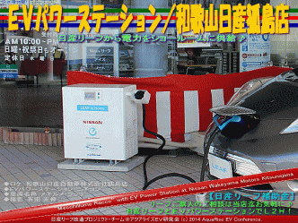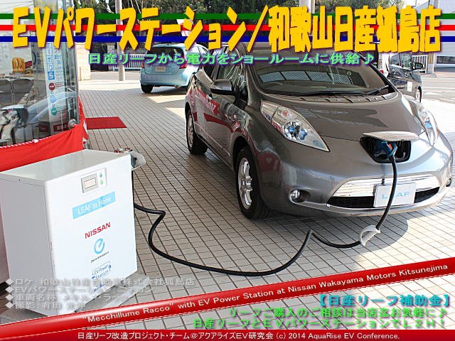 本日の紹介は、 <EVパワーステーション/和歌山日産狐島店@日産リーフ改造>です。 今までの記事で、EVパワーステーション関連の記事は以下です。 ★2013年9月5日(木)紹介 <リーフEVパワーステーション@日産リーフ改造> ★2013年11月22日(金)紹介 <走る蓄電池日産リーフ@日産リーフ改造> ★2013年12月5日(木)紹介 <リーフは家の蓄電池@日産リーフ改造> です。 和歌山日産自動車株式会社狐島店には、ニチコンのパワーステーションが設置されていて、深夜電力を利用して和歌山日産狐島店のショールームの電力供給をおこなっています。 今回、アクアライズEV研究会の日産リーフ改造カスタムカー<メキルメ・ラッコ>号が、ニチコンのパワーステーションで、和歌山日産狐島店の電力供給をおこなってみました。 以前も取り上げたEVパワーステーションは、とても役立つシステムです。 このEVパワーステーションを設置することによって、リーフの100Vや200Vの通常充電コンセント設置よりも効果的に、 ★ピークシフトに貢献 ★夜間電力を活用 ★EV充電を普通充電の2倍で快適 ★停電や災害時のバックアップ電力として活用 できるというメリットがあります。 | |||