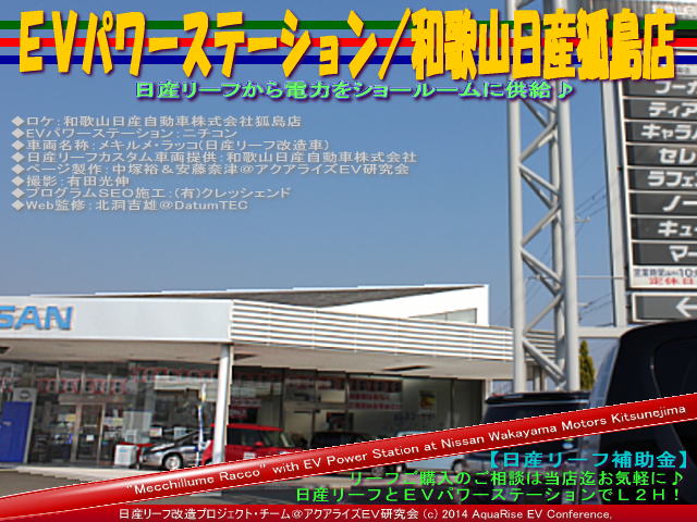本日の紹介は、 <メキルメ・ラッコ/和歌山日産狐島店@日産リーフ改造>です。 アクアライズEV研究会の日産リーフ改造カスタムカー<メキルメ・ラッコ>号が、和歌山日産自動車株式会社狐島店に初登場!消費税アップ後の注目電気自動車、日産リーフ改造カスタムカーです♪ 和歌山日産自動車株式会社狐島店は、気軽に立ち寄れる雰囲気のお店です。和歌山日産狐島店の近くには夏場には海水浴で賑わう加太海水浴場があり、雛流しで有名な淡島神社があります。 | ||||