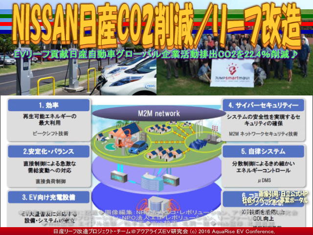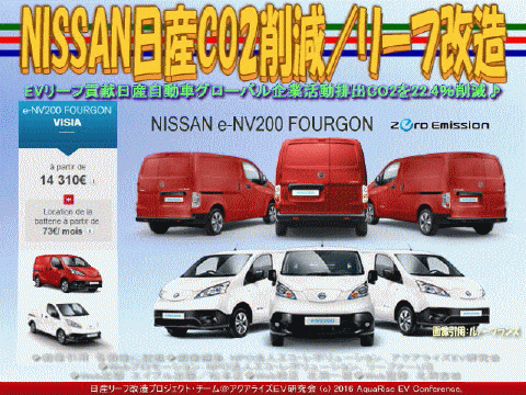日産NISSAN公式サイトの「ニュースリリース」ページの2016年07月01日版ニュースに『日産自動車、グローバル企業活動から排出するCO2を22.4%削減』という記事をさらに読みますと、<日産のCSO(チーフサステナビリティオフィサー)である川口均は、「当社は中期環境行動計画『ニッサン・グリーンプログラム2016(NGP2016)』の一環として、ゼロ・エミッション車や低燃費車の拡大、エネルギーや資源の多様性、効率性、リサイクルを、より一層推進していくことを目指しています。当社の中期環境目標に向け、日産の全従業員およびパートナー企業の継続的な取り組みが、これまでの成果につながっています」と述べました。>と記載されています。 【NISSAN日産CO2削減(2)/リーフ改造 01】 元々、日産NISSANがNISSAN新型日産リーフ(「新型リーフ30S」「新型リーフ30G」「新型リーフ30X」『新型リーフ30X展示(5)/和歌山日産中島店』『新型リーフ2015/リーフ改造研』『日産リーフ新型2015(5)/リーフ改造研』)や世界初の電気ミニバン「e-NV200」(※参照『クーマのパネトーネ(3)/e-NV200のパン屋さん』『e-NV200展示(2)/和歌山日産狐島店』『赤い日産e-NV200(3)/リーフ改造研』『eNV200急速充電/日産河内長野南』『リーフでNV200をEVコンバート改造(3)』等)や世界初の電気ミニバン「e-NV200」(※参照『クーマのパネトーネ(3)/e-NV200のパン屋さん』『e-NV200展示(2)/和歌山日産狐島店』『赤い日産e-NV200(3)/リーフ改造研』『eNV200急速充電/日産河内長野南』『リーフでNV200をEVコンバート改造(3)』等)のEV電気自動車を開発して市場にリリースした時点で、世界初の革新的で正当性のあるビジネスを展開してきました。 【NISSAN日産CO2削減(2)/リーフ改造 02】 日産NISSANは、単に利益を求める企業の立ち位置ではなく、もちろん資本主義社会での株式会社ですので利益を追求するのは当然ですが、人のため世のため社会に役立つ、地球的グローバルな視点から地球温暖化防止活動=ゼロエミッションにも積極的に取り組んできています。所謂、大気を汚染するCO2を排出する自動車メーカーとして、グローバル企業としてのNISSAN日産の矜持(きょうじ・きんじ)としてSDやCSR(『EVメーカーのSDとCSR(3)EV研究会』『EVメーカーのSDとCSR(2)/EV研究会』『EVメーカーのSDとCSR/EV研究会』『EVメーカーのCSR(3)/リーフEV研』『EVメーカーのCSR(2)/リーフEV研』『EVメーカーのCSR/リーフEV研』等)に真剣に取り組んでいる結果が、この『日産自動車、グローバル企業活動から排出するCO2を22.4%削減』です。 【NISSAN日産CO2削減(2)/リーフ改造 03】 今や世界はEV電気自動車の流れになってきています。EV電気自動車と太陽光発電とEVパワーステーション(※参照『EVパワーステーション/狐島店@和歌山日産』『EVパワーステーション/和歌山日産狐島店@日産リーフ改造』『リーフEVパワーステーション@日産リーフ改造』『走る蓄電池日産リーフ@日産リーフ改造』『リーフは家の蓄電池@日産リーフ改造』等)を活用したスマートハウス、そしてそれらのスマートハウス(SH)をインテグレーションするスマートシティ=スマートコミュニティ(SC)がこれからどんどん構築されていくと思います。 【NISSAN日産CO2削減(2)/リーフ改造 04】 こんな流れの中で、日産NISSANは、<日産自動車、グローバル企業活動から排出するCO2を22.4%削減>したという訳です。・・・次回のブログ『NISSAN日産CO2削減(3)/リーフ改造』につづく ちなみに、本アクアライズEV研究会で作成してあるCHAdeMO方式の急速充電スポットや200V普通充電スタンド関連のブログは以下のファイルに、五十音別順にまとめています。 『急速充電スポット160701/リーフ改造』 参考までにご覧いただければ幸いです。 地球温暖化、SD、CSR関連のブログ記事は以下のようにアップしてあります。 『EVメーカーのSDとCSR(3)EV研究会』 『EVメーカーのSDとCSR(2)/EV研究会』 『EVメーカーのSDとCSR/EV研究会』 『EVメーカーのCSR(3)/リーフEV研』 『EVメーカーのCSR(2)/リーフEV研』 『EVメーカーのCSR/リーフEV研』 『新生リーフIDS世界制覇/日産リーフ改造研』です。 『日産リーフ20万台売れた(5)/2015販売台数』 『日産リーフ20万台売れた(4)/30kWhASV』 『日産リーフ20万台売れた(3)/ルノー日産』 『日産リーフ20万台売れた(2)/新型お得』 『日産リーフ20万台売れた/新型リーフ』 『地球温暖化対策/NPOエコ・レボリューション』 『COP21(3)/NPO法人エコ・レボリューション』 『COP21(2)/NPO法人エコ・レボリューション』 『COP21/NPO法人エコ・レボリューション』 『公式サイト/NPO法人エコ・レボリューション』 『コストコ買物/NPO法人エコ・レボリューション』 『EVカーステーション(5)/リーフ改造研』 『EVカーステーション(4)/リーフ改造研』 『EVカーステーション(3)/リーフ改造研』 『EVカーステーション(2)/リーフ改造研』 『EVカーステーション/リーフ改造研』 『EVパワーステーション/狐島店@和歌山日産』 『EVパワーステーション/和歌山日産狐島店@日産リーフ改造』 『リーフEVパワーステーション@日産リーフ改造』 『走る蓄電池日産リーフ@日