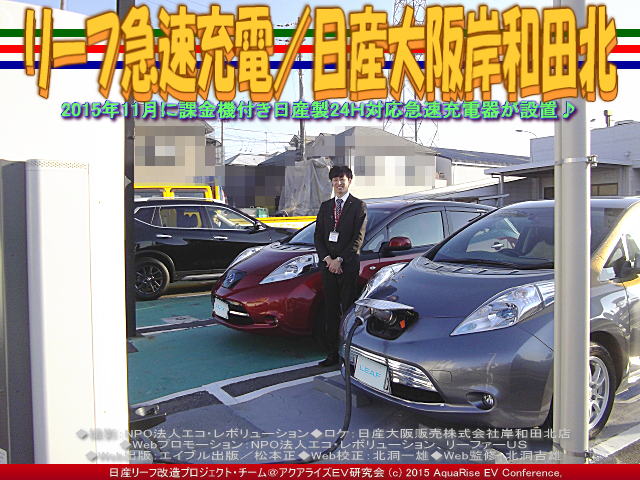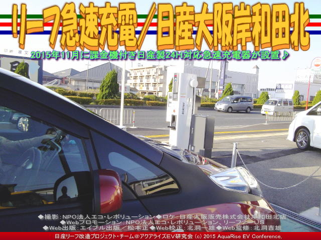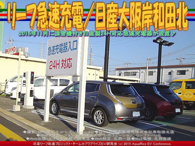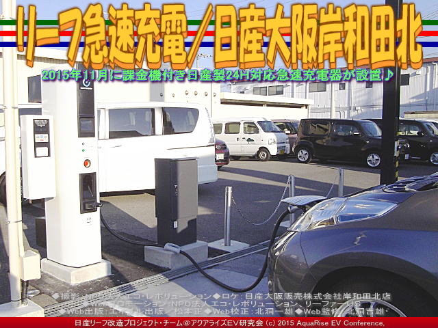 今回の紹介ブログは、『リーフ急速充電/日産大阪岸和田北』です。 前回の12/23ブログ『日産岸和田北店に急速充電器/EV研』の続きです。 ※本ブログは、私たちボランティア団体である当アクアライズEV研究会(別名:「リーフEV研」や「リーフ改造研」や「リーフ改造EV研」や「EV研究会」や「EV研」や「AREV神戸」)が中心となって作成。特定非営利活動促進法に基づき法人格を得た団体(特定非営利活動法人)NPO法人エコ・レボリューション(NPO法人エコ・レボリューションCOMまたはNPO法人エコ・レボリューションNET、そしてNPO法人エコ・レボリューションINFO)の傘下で活動しています。 ※以下で紹介する画像は、NPO法人エコ・レボリューションとアクアライズEV研究会が撮影した画像は、各関係団体の使用許諾または使用ルールにしたがって使用しています。