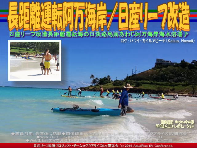 今回の紹介ブログは『リーフ改造で行く海の日淡路島海水浴』です。画像は、「長距離運転阿万海岸/リーフ改造」というタイトルで統一して、4作起承転結シリーズでお届けします。 先日、当NPO法人エコ・レボリューション(エコレボNET、エコレボCOM、エコレボINFO)で山の日を書きましたが、やはり海の日も書いておく必要があるかなって思って書いています。 【リーフ改造で行く海の日淡路島海水浴 01】 ちなみに、山の日については以下のブログページを作成してあります。 ◎160825『国民の祝日山の日(3)/エコレボ』 ◎160824『国民の祝日山の日(2)/エコレボ』 ◎160823『国民の祝日山の日/エコレボ』 ◎160814『山の日(3)/NPOエコレボ』 ◎160813『山の日(2)/NPO法人エコレボ』 ◎160812『山の日/NPO法人エコ・レボリューション』 あわせてご覧いただければ幸いです。 【リーフ改造で行く海の日淡路島海水浴 02】 ようし、お仕事にとボランティア活動にと頑張っている自分達へのご褒美としてリッチに海外へ泳ぎに行こう、なんちゃって。南イタリアナポリ(Napoli, Italia)やアマルフィ海岸(Amalfi, Italia)、ハワイ・カイルアビーチ(Kailua, Hawaii)やグアム・ココパーム・ガーデン・ビーチ(Cocopalm Garden Beach, Guam)等色々な意見。結局、皆で話し合った結果、淡路島ということになりました。確かに海の外で海外ですが。 ・・・ショボイなあ・・・/(^_^;)>。 ちなみに、画像だけでも豪勢に(笑)。うちの理事が今年もハワイへ自費で。ついでにリーフの画像も撮りに行ったハワイ・カイルアビーチ(Kailua, Hawaii)のショット画像を掲載します。 【リーフ改造で行く海の日淡路島海水浴 03】 淡路島にも良い海水浴場があるようです。行く前にいくつかネットで検索しました。2016年8月22日時点では<淡路島人気ランキング- 海水浴場-淡路島WEB「あわじウェブドットコム」>によると、 第1位=淡路島FBI船瀬ビーチイン 船瀬キャンプ場・海水浴場 第2位=阿万海岸海水浴場 第3位=慶野松原海水浴場 & 慶野松原一般キャンプ場 第4位=淡路マリンスポーツ il mare(イルマーレ) 第5位=多賀の浜海水浴場 第6位(同得点)=沼島海水浴場 第6位(同得点)=炬口海水浴場 第6位(同得点)=大浜海水浴場 第6位(同得点)=丸山海水浴場 第10位=伊毘海水浴場 オートキャンプ場 伊毘うずしお村 となっています。 さあ、どこに行こうかな?・・・つづく。 |