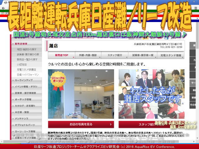 今回は「兵庫日産灘店」への長距離運転と急速充電です。最近は急速充電に立ち寄った時は、「長距離運転」と「急速充電」に的を絞ってお伝えしています。利用させていただく急速充電スポットは、時には私たちのNPO法人エコ・レボリューション(COM、NET、INFO)やAREVCアクアライズEV研究会から遠くない場合もあります。しかしもしこのブログを読んでいただいているリーファー(リーフ乗り)さんが日本国中の都道府県の遠方よりいらっしゃる場合もあるかもしれませんので、やはり「長距離運転」というタイトルにしています。 【長距離運転兵庫日産灘/リーフ改造 01】 ここ数日、兵庫日産さんの急速充電スポットで、私がいつもお世話になっている急速充電スポット関連のブログは以下のように作成しています。 『急速充電兵庫日産御影店/リーフ改造』 『長距離運転兵庫日産御影/リーフ改造』 『リーフ長距離運転/兵庫日産姫路東』 『リーフ急速充電/兵庫日産姫路東店』 『リーフ急速充電/兵庫日産明石中央店』 『兵庫日産明石中央で充電/リーフ改造』 『リーフ急速充電/兵庫日産三田店』 『兵庫日産三田店で急速充電/リーフ改造』 『新春初売り2016/兵庫日産岡場店』 『リーフ急速充電/兵庫日産鈴蘭台北店』 『リーフ急速充電/兵庫日産三田東店』 『リーフ急速充電/兵庫日産高砂竜山店』 『リーフ急速充電/兵庫日産高砂中島店』 『リーフ急速充電/兵庫日産三木東店』 『リーフ急速充電/兵庫日産三木店』 ご覧いただければ幸いです。 【長距離運転兵庫日産灘/リーフ改造 02】 今日紹介している兵庫日産灘店は兵庫県の兵庫日産株式会社の管轄下にあります。兵庫日産さんはすべての日産のお店に急速充電器を設置完了して凄いデス。公式ページを見ると、<クルマとの出会いを心から楽しめる空間と時間をご用意します。阪神電車の新在家駅より徒歩5分です。国道2号線、徳井の交差点を南へ、処女塚の交差点を西へ100メートルです。国道43号線にも面しております。当店は女性とお子様にやさしいお店づくりを目指しております。スタッフ一同、ご来店を心待ちにしております。ぜひお気軽にお立ち寄り下さい。ショールームをリニューアルいたしました!人気車を揃えています。屋外にも展示場がございます。キッズコーナーは、商談コーナーから目も届きパパ、ママも安心。広く、入りやすい出入り口です!かばん等を入れる小物入れもご用意しています。エキスパートショップとしての高級車もご用意。>とあります。確かにその通りで、急速充電での待ち時間はリラックスできます。 【長距離運転兵庫日産灘/リーフ改造 03】 兵庫日産灘店の正式名称は兵庫日産株式会社姫路東店です。以下に兵庫日産灘店のお店の情報を以下に紹介します。 【兵庫日産灘店】 □お店の名前: 兵庫日産灘店 □よみ: ひょうごにっさんなだてん □住所: 〒658-0044 兵庫県神戸市東灘区御影塚町4丁目3番27号 □電話: Tel.078-821-3239 Fax.078-843-0625 □営業時間: 10:00~19:00 □サービス受付: 10:00~18:00 □200V普通充電器: 設置有り(お店の営業時間に準じる) □急速充電器: 設置有り(24時間稼働) □公式ページ: 兵庫日産灘店 □アクセス: マップはこちらから。 ※以上、兵庫日産灘店の公式ページを参照、一部レイアウト編集。データは2016年5月時点のものです。時間の経過により正確でなくなる場合がありますので、ご了承ください。 【長距離運転兵庫日産灘/リーフ改造 04】 ちなみに、本アクアライズEV研究会で作成してあるCHAdeMO方式の急速充電スポットや200V普通充電スタンド関連のブログは以下のファイルに、五十音別順にまとめています。 『急速充電スポット160501/リーフ改造』 参考までにご覧いただければ幸いです。 | ||||