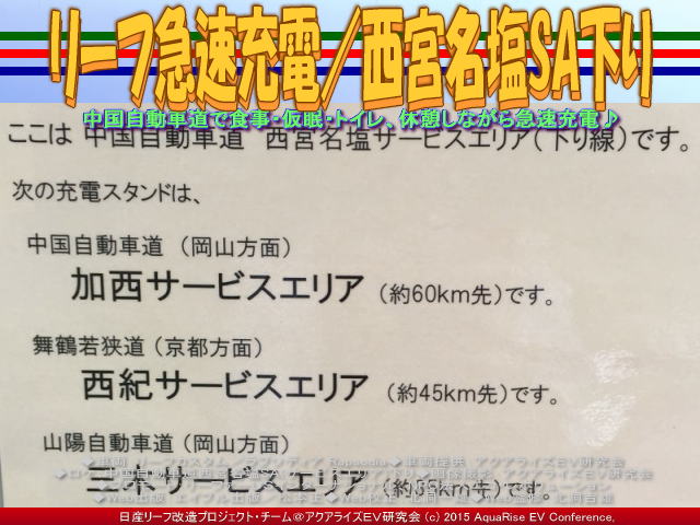 中国自動車道西宮名塩SA下り((ちゅうごくじどうしゃどう にしのみやなじお サービスエリア くだり)の充電スポットです。 中国自動車道西宮名塩SA下りの充電スポットというタイトルで、2015年7月8日(水)版のブログでも書いていますが、先日ここの充電スポットに到着したときは、かわいい三菱のアイミーブ(三菱i-MiEV)が停まって、充電していました。 この中国自動車道西宮名塩SA下り((ちゅうごくじどうしゃどう にしのみやなじお サービスエリア くだり)はよく利用します。ここの充電スポットは、下の画像のように、サービスエリア内のお店やトイレ等の本館というか、メイン施設の手前側にあるのでウレシく思います。 【リーフ急速充電/西宮名塩SA下り 01】 高速道路のたいていの急速充電スポットは、SA(サービスエリア)やPA(パーキングエリア)の一番奥の外れにぽつんとあって、なんか端っこに追いやられているようで、すこし寂しいです。まして充電スポットに待機用のスペースがなければ不便な思いをします。例えば、充電の先客がいらっしゃる場合は、皆さんが停めている駐車場に戻るのに、逆行したり、バックしたりしなければいけません。その点、この西宮名塩SA下りは、寂しい思いや不便な思いをすることはありません。また、中国自動車道西宮名塩SA上りの充電スポットには、待機用のスペースがあり便利です。この中国自動車道西宮名塩SAの充電スポットは、上り下り線とも、EV電気自動車ドライバーには優しい設計になっています。 【リーフ急速充電/西宮名塩SA下り 02】 西宮名塩SAは西宮北インター寄りの山あいにあります。西宮名塩SAから広島・下関方面へこの先ちょっと行けば、阪神高速道路北神戸線と分岐し、さらに、山陽道、舞鶴若狭自動車道と分岐します。ず~っと長い上り坂が続きます。長~い長~い、なだらかで真っ直ぐな坂道です。下り線では、上り坂。上り線では下り坂です。なんか面白いです。連休や年末年始の時などはひどい交通渋滞の起こる地点で有名なところです。交通情報で「宝塚西トンネルを先頭に・・・」という情報を、よく聞くことがあると思います。でも、この日は平日なので、とてもスムーズに走ることができました。 【リーフ急速充電/西宮名塩SA下り 03】 ちなみに、西宮名塩SAからの直ぐ手前のサービスエリア(SA)・パーキングエリア(PA)は、阪和自動車道では約80.0kmで岸和田SA(上)、西名阪自動車道では約63.1kmで香芝SA(上)、名神高速道路では約48.3kmで桂川PA(下)といずれも距離が長いです。 西宮名塩SAから次のサービスエリア(SA)・パーキングエリア(PA)は、中国自動車道では14.3kmで赤松PA(下)、そして山陽自動車道では約14.8km淡河PA(下)があります。私のようなヘビーリーファー(長距離リーフ乗り)にとって、上の画像のような<次の充電スタンドは、中国自動車道岡山方面加西サービスエリア約60km先>や<舞鶴若狭道京都方面西紀サービスエリア約45km先>や<山陽自動車道岡山方面三木サービスエリア約35km先>の「次の充電スタンド案内」はありがたい情報です。 ちなみに、アクアライズEV研究会サイトの急速充電や新急速充電(QC)そして普通充電の関連ページは、本ページを含めて、 『リーフ急速充電/西宮名塩SA下り』 『リーフ急速充電/山陽道三木SA(下り)』 『リーフ急速充電/第二神明道路明石SA』 『リーフ急速充電/阪神高速湾岸線中島PA』 『リーフ急速充電/日産大阪豊中北』 『eNV200急速充電/日産河内長野南』 『eNV200急速充電/日産大阪高石』 『eNV200急速充電/日産大阪貝塚北』 『eNV200急速充電/日産大阪八尾』 『eNV200急速充電/日産大阪堀江』 『リーフ急速充電/日産大阪堀江』 『リーフ急速充電/日産大阪住之江』 『ドイツEV充電システム(2)/リーフ改造研』 『ドイツEV充電システム/リーフ改造研』 『黄リーフ充電日産高石店/リーフ改造』 『テスラ急速充電/EVテスラ研究会』 『テスラ急速充電(2)/日産和泉中央』 『テスラ急速充電/日産和泉中央』 『改造リーフ充電/道の駅吉野路大塔』 『改造リーフ急速充電/熊野本宮館』 『リーフ急速充電/和歌山龍游@リーフカスタム』 『リーフ急速充電/和歌山めっけもん@リーフカスタム』 『リーフ急速充電/和歌山九度山@リーフカスタム』 『リーフ急速充電/和歌山イオン』 『リーフ急速充電/和歌山日産大浦@リーフカスタム』 『リーフ急速充電/和歌山日産大浦@リーフカスタム(2)』 『リーフ急速充電/草津PA下り@リーフカスタム』 『リーフ急速充電/日産大阪川西@リーフカスタム』 『リーフ急速充電/日産河内長野南@リーフカスタム』 『リーフ急速充電/日産大阪泉北@リーフカスタム』 『リーフ急速充電/日産大阪鳳南(1)@リーフカスタム』 『リーフ急速充電/日産大阪鳳南(2)@リーフカスタム』 『リーフ急速充電/日産大阪高石@リーフカスタム』 『リーフ急速充電/日産岸和田南』 『リーフ急速充電/日産大阪堺店』 『リーフ急速充電/しみず温泉@日産リーフ改造』 『日産リーフ200V普通充電@リーフカスタム』 『リーフカスタム急速充電@日産リーフ