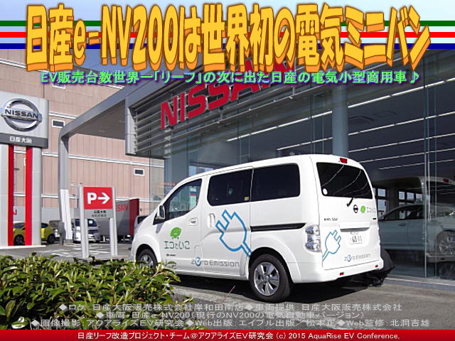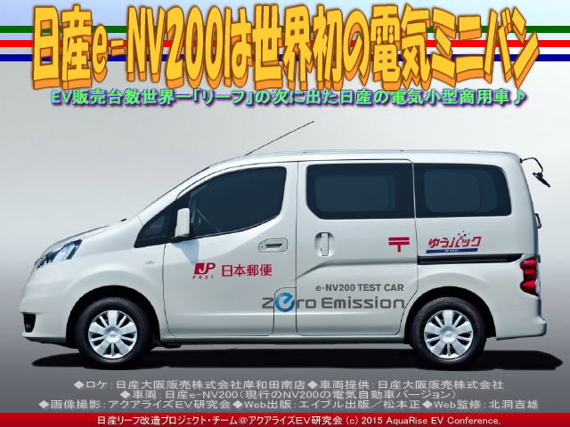 ◆車両:日産e-NV200(現行のNV200の電気自動車バージョン) ◆ロケ:日産大阪販売株式会社岸和田南店 ◆車両提供:日産大阪販売株式会社 ◆画像撮影:アクアライズEV研究会 ◆プロモート:リーファーUSインターナショナル ◆Web出版:エイブル出版/松本正 ◆Web校正:北洞一雄 ◆Web監修:北洞吉雄 | ||||