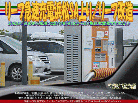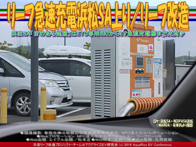 浜松SA(はままつサービスエリア)は、NEOPASA浜松ともよばれ、静岡県浜松市浜北区・北区にある新東名高速道路のサービスエリアで、コンセプトは「音のある風景」です。当浜松SA=NEOPASA浜松には、SIC(スマートインターチェンジ)が併設されています。※スマートインターチェンジは、高速道路の本線上(本線直結型)またはサービスエリア (SA)、パーキングエリア (PA)、バスストップ (BS) に設置されているETC専用のインターチェンジ (IC)のことで、ここでは「SIC(スマートIC)」と表記しています。 【リーフ長距離運転/新東名浜松SA上り 01】 当ブログの画像のサブタイトルに<浜松SA「音のある風景」はETC専用SICからEV急速充電器まで充実♪>と書いていますように、この浜松SA=NEOPASA浜松はEV電気自動車で移動の際には、クルマの急速充電やドライバーの休息充電に立ち寄るには最適の(サービスエリアです。画像でもお分かりのように、浜松SA=NEOPASA浜松の店舗棟のデザインはピアノをモチーフにしています。さすが「音楽と楽器の街・浜松」です。 【リーフ長距離運転/新東名浜松SA上り 02】 今回、和歌山日産本社中島店(『リニューアルオープン/和歌山日産中島店』『リニューアル内見会/和歌山日産中島店』『リーフ改造ラプソディア(3)/和歌山日産』『リーフ改造ラプソディア(2)/和歌山日産』『リーフ改造ラプソディア/和歌山日産』『エコなスーパーカーの条件(1)/リーフ改造』『80周年リーフ/和歌山日産@日産リーフ改造』『和歌山日産リーフ新春初売り@日産リーフ改造』)の有田課長さんが「日産リーフで行く長距離ドライブ~598.32km東京台場ガンダムへの旅」を実施しました。 【リーフ長距離運転/新東名浜松SA上り 03】 新東名高速道路浜松SA上りをネットで調べると、 【新東名高速道路浜松SA上り】 ■名称: 浜松SA上り(はままつサービスエリアのぼり) ■名称2:NEOPASA浜松(ネオパーサはままつ) ■住所: 〒431-2102静岡県浜松市浜北区四大地9-6 ■住所2: 〒434-0005静岡県浜松市 浜北区大平36 ■所属路線: 新東名高速道路 ■座標: 北緯34度50分30.5秒 東経137度44分58.5秒 ■駐車場: 大型:94台/小型:92台 ■トイレ: 男大:14/男小:24/女:60 ■バリアフリー: 駐車スペース大型:1/駐車スペース小型:2/トイレ:4箇所 ■各種施設・サービス案内:コンシェルジュ、スマートIC、ガソリンスタンド、給電スタンド、コンビニ、ATM、総合案内、オストメイトトイレ、おむつ交換台、授乳室、ドッグラン、ハイウェイ情報ターミナル、ミュージックスポット(ヤマハの楽器を展示)、スナックコーナー、コンビニ、キッズコーナー、ドライバーズスポット(コインランドリー、シャワールーム、マッサージチェア)、ドッグラン、展望台、郵便ポスト(浜北郵便局)、)セルフ式・24時間ガソリンスタンドなど。 ■電話: 053-580-1360 ■運営会社: 中日本高速道路(株) NEXCO中日本 ■公式ページ:こちらから見れます。 ■浜松SAぶらっとパーク ※各データは2016年1月調査したものです。データが古い場合や間違っている場合がありますので、詳しくはネットまたは関係各所でお調べくださいませ。 【リーフ長距離運転/新東名浜松SA上り 04】 私はわが愛車<ラプソディア>号で東京へはお仕事がらみや東京モーターショー取材兼見学などで数回行っています。ちなみに、有田課長さん愛車の法定順守のドレスアップ日産リーフ改造カスタムコンプリートカー<MARIDA>号(5年リーフで走行距離も6万Km越えのリチウムイオン電池メーターレベル11/12で少々劣化中)で行く「日産リーフで行く長距離ドライブ~598.32km東京台場ガンダムへの旅」での有田課長さんの東京台場ガンダムへの行程は、和歌山日産中島店→日産サティオ奈良 高田支店→伊賀SA→御在所SA→刈谷SA→浜松SA→静岡SA→駿河湾沼津SA→足柄SA→海老名SA→ガンダムフロント東京・お台場ダイバーシティ東京プラザです。実際は片道4回の急速充電停車で充分ですが、今回の長距離運転は充電スポット案内も兼ねたラインです。 ・・・次回の『リーフ急速充電浜松SA上り/リーフ改造』につづく ちなみに、日産リーフで行く長距離ドライブ・長距離運転のブログは、最近は「急速充電」ブログと重なっています。長距離を走るとどうしても急速充電スポットが不可欠です。長距離ドライブ・長距離運転=急速充電ブログは膨大な数に及んでいますので、間引きして以下にリストします。 『リーフ急速充電刈谷PA上り/リーフ改造』 『リーフ長距離運転/伊勢湾岸刈谷PA上り』 『リーフ急速充電御在所SA上り/リーフ改造』 『リーフ長距離運転/東名阪御在所SA上り』 『リーフ急速充電伊賀SA上り/リーフ改造』 『リーフ長距離運転/名阪国道伊賀SA上り』 『日産リーフ長距離ドライブ(東京)/リーフ改造』 『リーフ長距離運転・東京/日産リーフ改造』 『リーフ急速充電/京都日産桂店』 『京都日産桂店で急速充電/リーフ改造』 『リーフ急速充電(2)/イオンモール和歌山』 『リーフ急速充電/イオンモール和歌山』 『リーフ急速充電/和歌山日産狐島店』 『リーフ急速充電/兵庫日産
