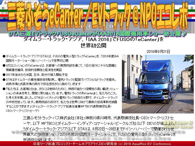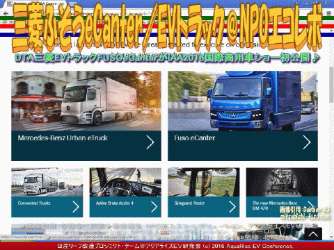 以上、三菱ふそうeCanter/EVトラック@NPOエコレボの各画像はクリックで全て640x480pxlsに拡大します。 ※本ブログページのすべての画像3枚をスライドショー480x360pxlsで見られます。 ※電気自動車EVトラックについての前シリーズ3作トリオロジーブログの全画像9枚が320x240大のスライドショーで見られます。 |
